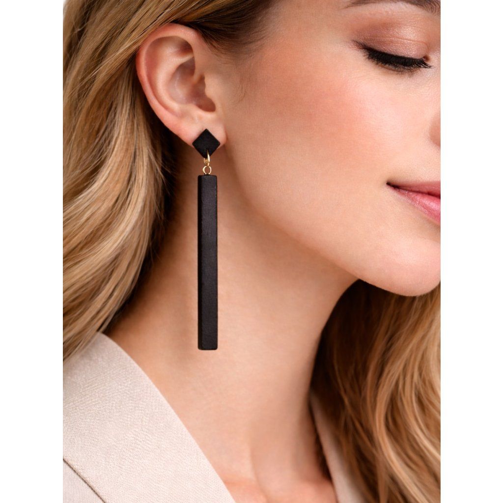 Tyto visací náušnice z bukového dřeva zaujmou na první pohled svou jednoduchostí a čistým designem. Kombinace hluboké černé barvy a jemného zlatého detailu působí elegantně a nadčasově, takže se hodí jak k běžnému nošení, tak i k výraznějším outfitům.