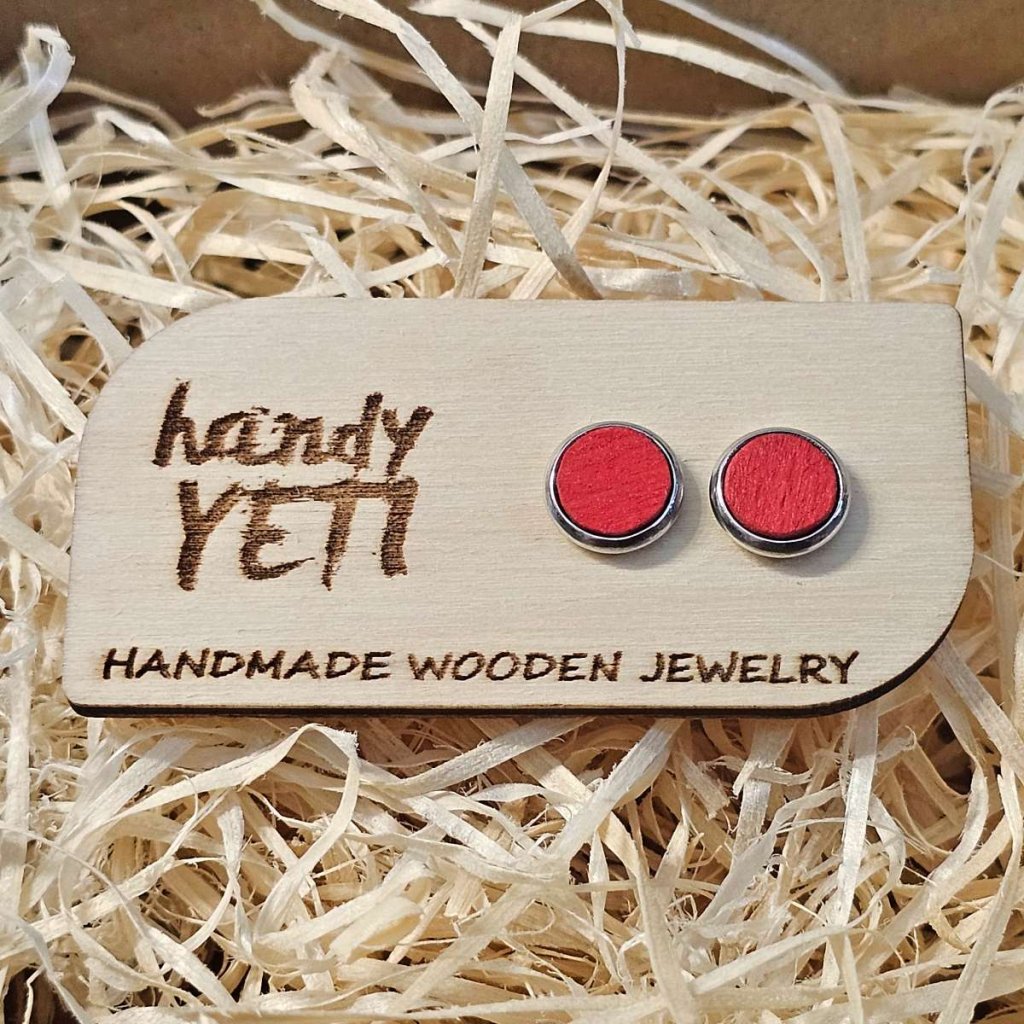 Červené dřevěné náušnice z buku v kovové puzetě – 8 mm