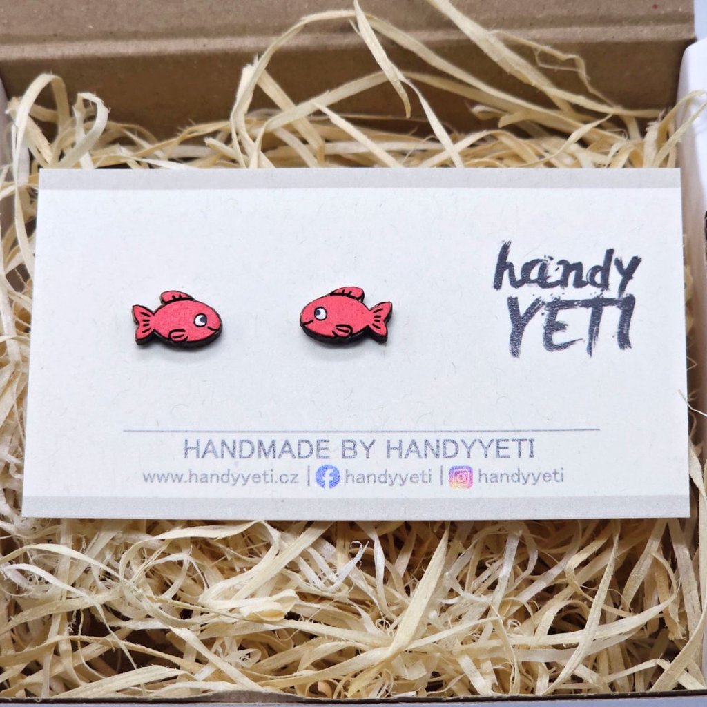 Dřevěné náušnice červené korálové rybky – hravý detail pro každý den