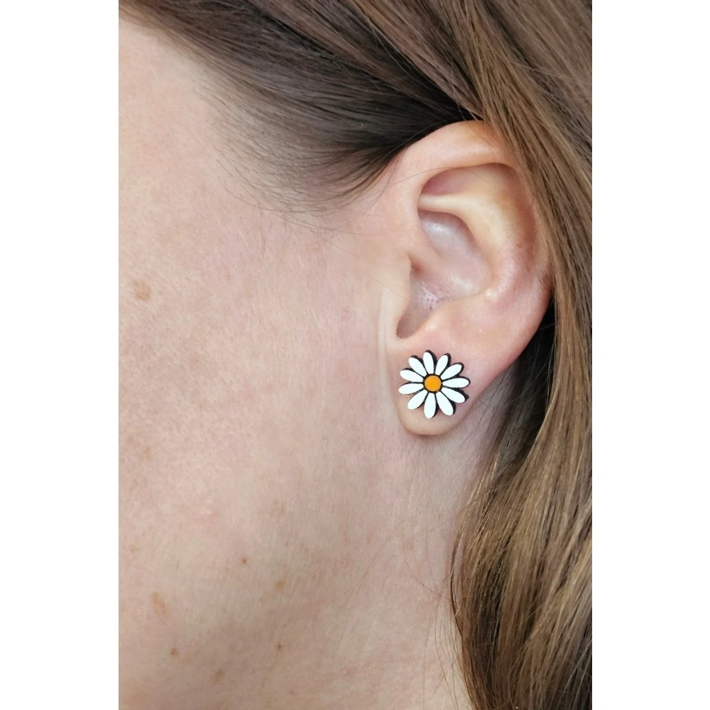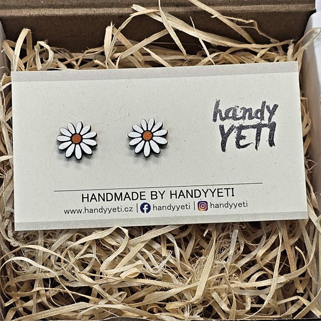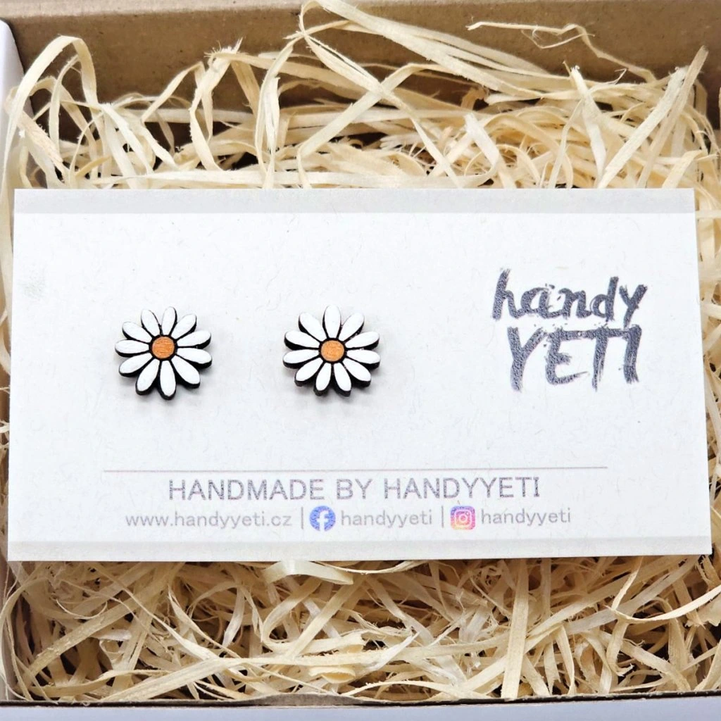 Dřevěné náušnice s motivem kopretiny jsou vyrobené z bukového dřeva a ručně malované akrylovými barvami. Motiv vychází z jednoduchého kruhového tvaru květu s výrazným středem a pravidelně rozmístěnými okvětními lístky, díky čemuž je dobře čitelný i v menším rozměru.