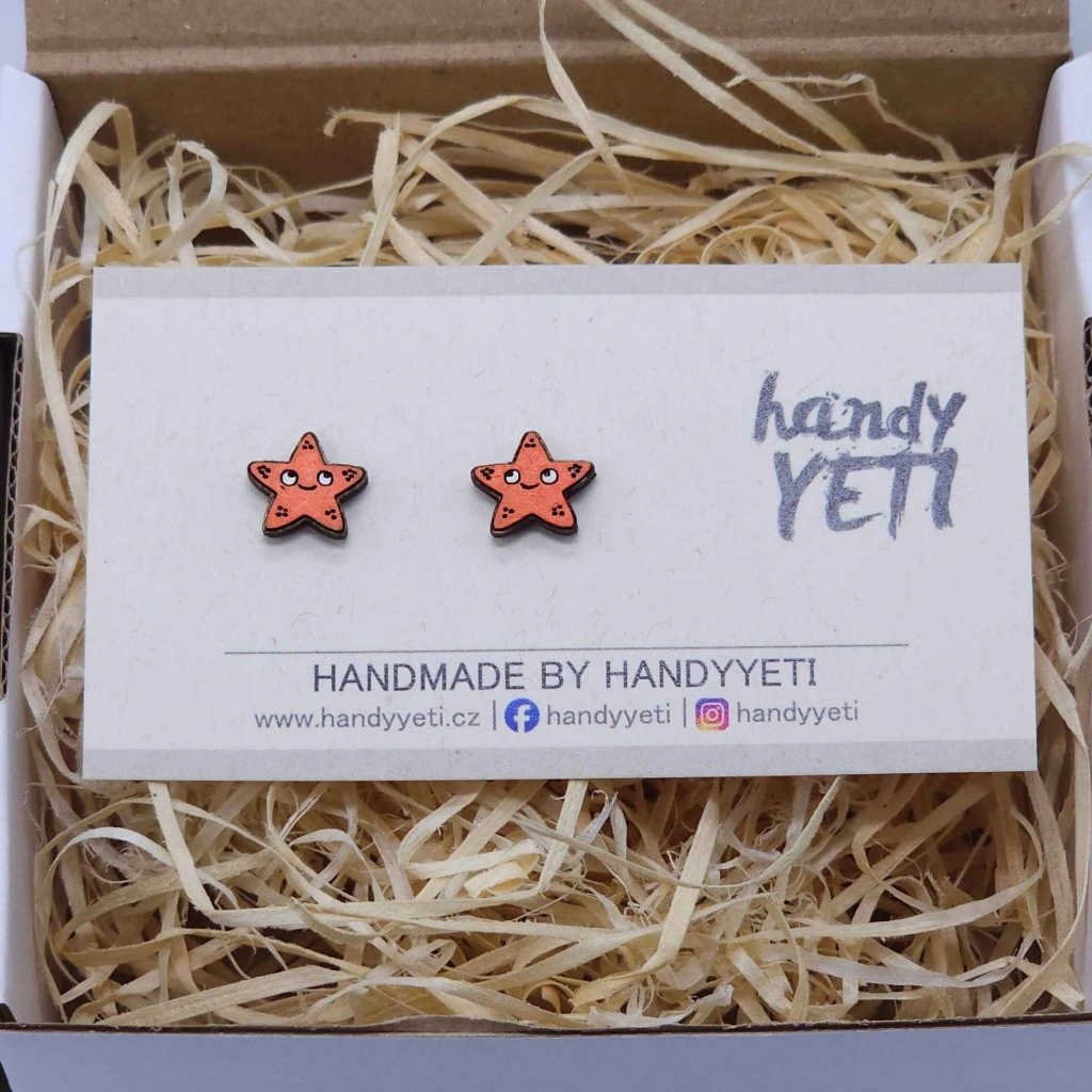 Dřevěné náušnice s motivem mořské hvězdy jsou vyrobené z bukového dřeva a ručně barvené do oranžového odstínu. Stylizovaný tvar hvězdy je jednoduchý, dobře čitelný a působí přirozeně a hravě.
