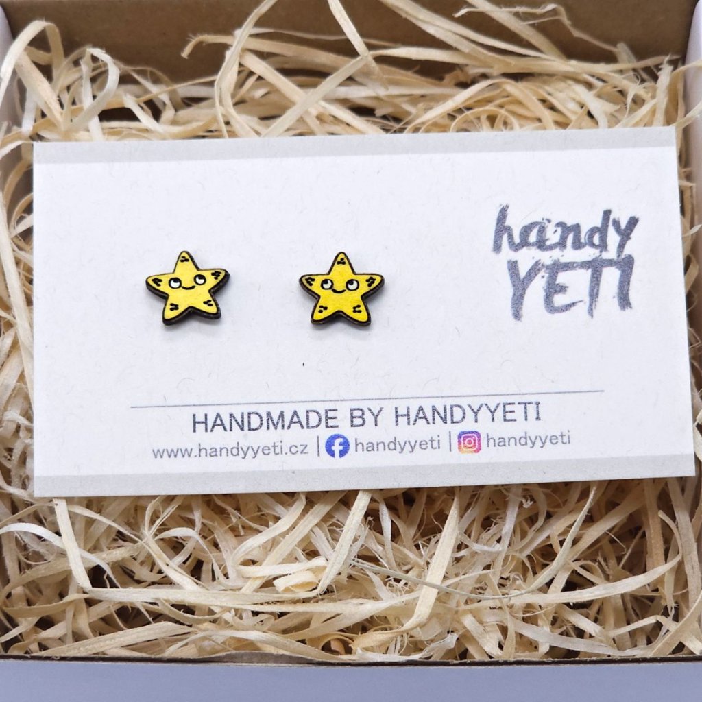 Dřevěné náušnice s motivem mořské hvězdy jsou vyrobené z bukového dřeva a ručně barvené do žlutého odstínu. Stylizovaný tvar hvězdy je jednoduchý, dobře čitelný a působí přirozeně a hravě.