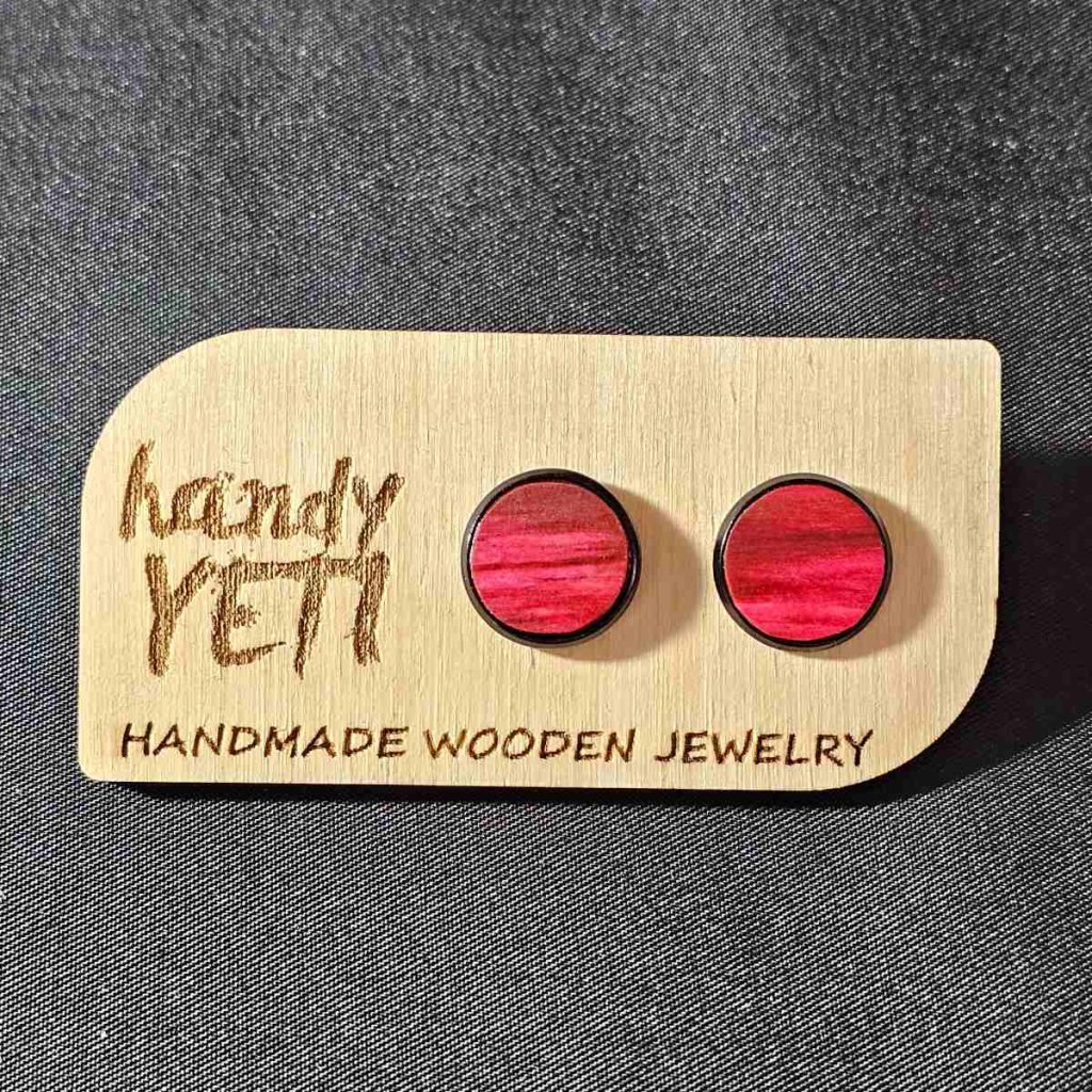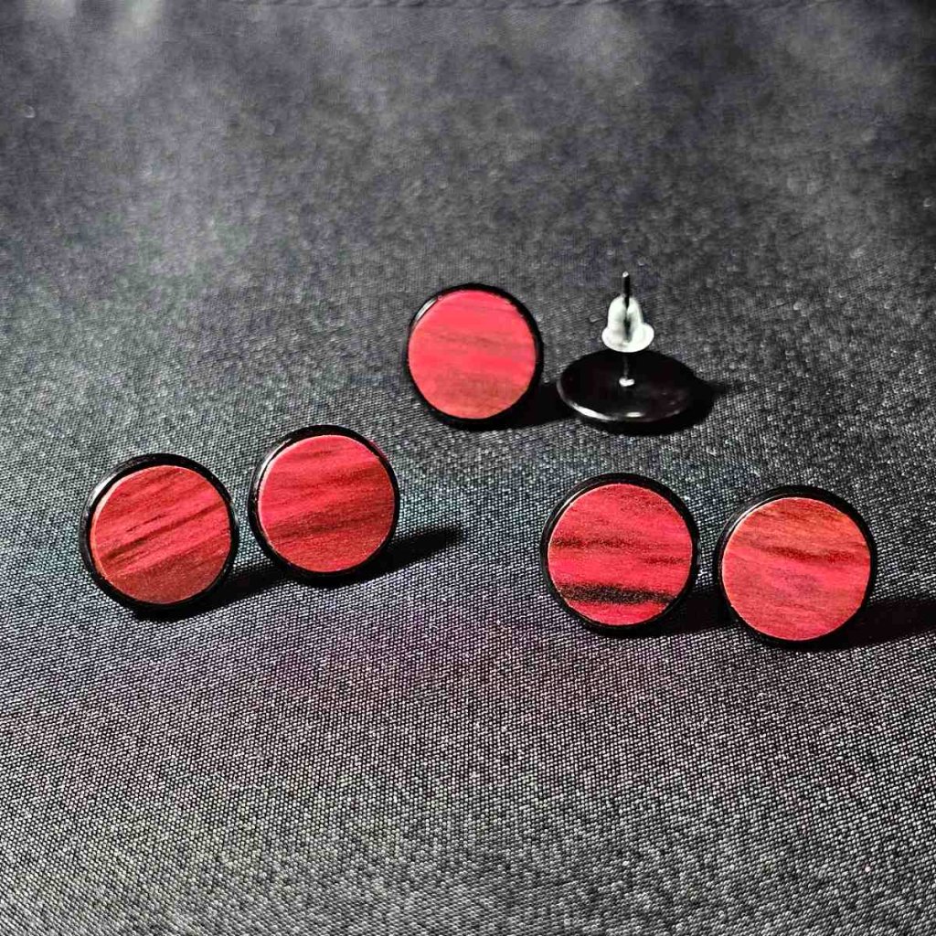 Náušnice mají průměr 12 mm a jsou zasazené do černých bižuterních puzet, které dodávají šperku jemný kontrast a zvýrazňují sytý odstín červené jabloně. Povrch dřeva nechávám nelakovaný, aby zůstal přirozeně hebký na dotek. K finálnímu ošetření používám prémiový olej Odies Oil, který prohlubuje barvu a chrání dřevo před vysycháním.