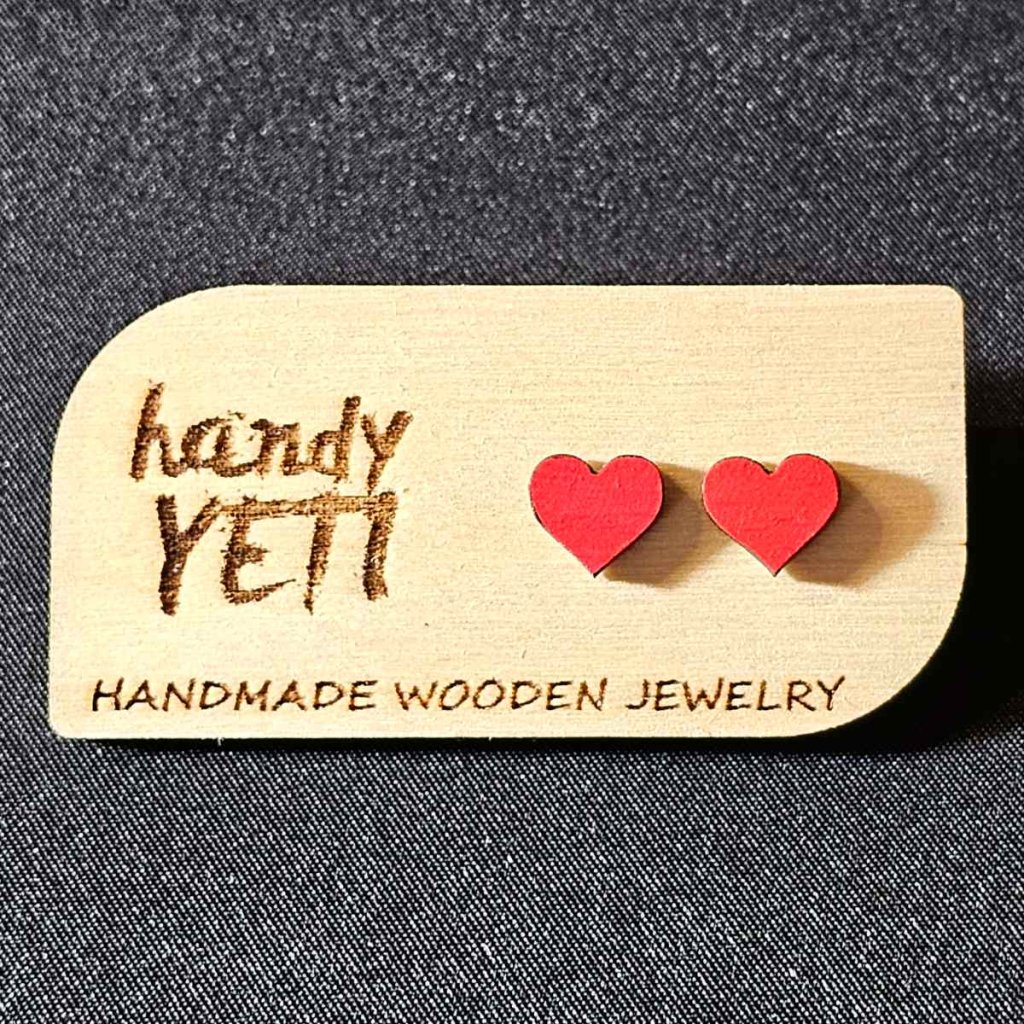 Dřevěné náušnice pecky – červená srdíčka z bukového dřeva (9×9 mm)