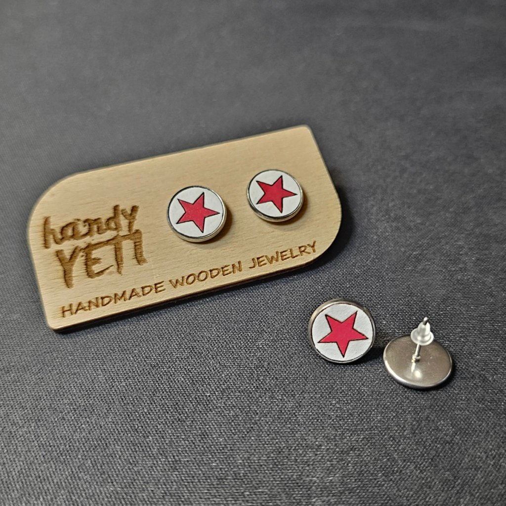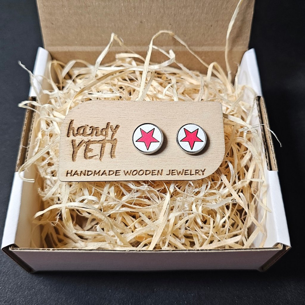 Originální dřevěné náušnice vyrobené z kvalitního bukového dřeva zdobené ručně malovaným motivem červené pěticípé hvězdy na bílém pozadí. Každý pár je ručně malovaný, takže je každý kus jedinečný a má svůj vlastní charakter. Povrch dřeva je chráněný lakem s certifikací pro dětské hračky, který zajišťuje bezpečné nošení i dlouhou životnost.