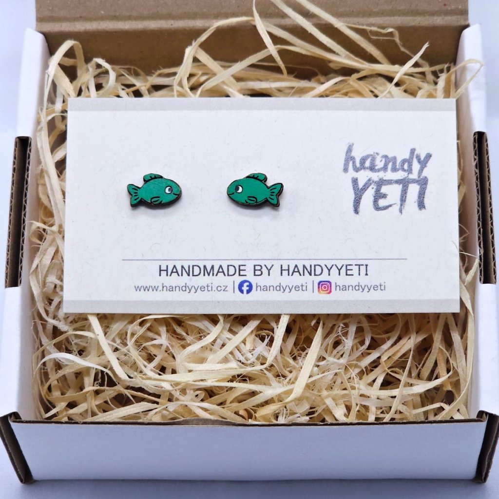 Dřevěné náušnice zelené korálové rybky – hravý detail pro každý den