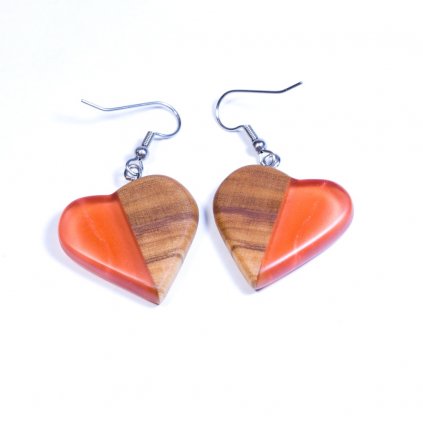 Náušnice ze dřeva červenohnědého exotického padouku a pryskyřice růžové barvy. Dřevo je ošetřeno směsí přírodních olejů.