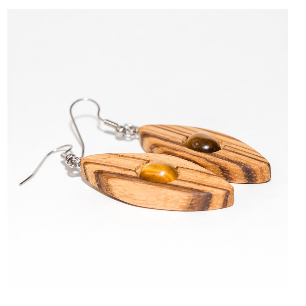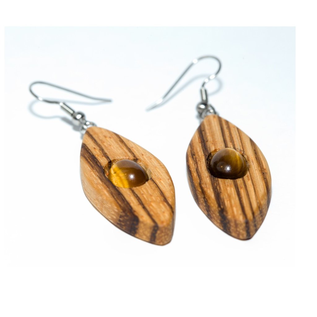 Náušnice ze dřeva zebrano s tygřím okem. Náušnice jsou na bižuterních háčcích, dřevo je ošetřeno směsí přírodních olejů.