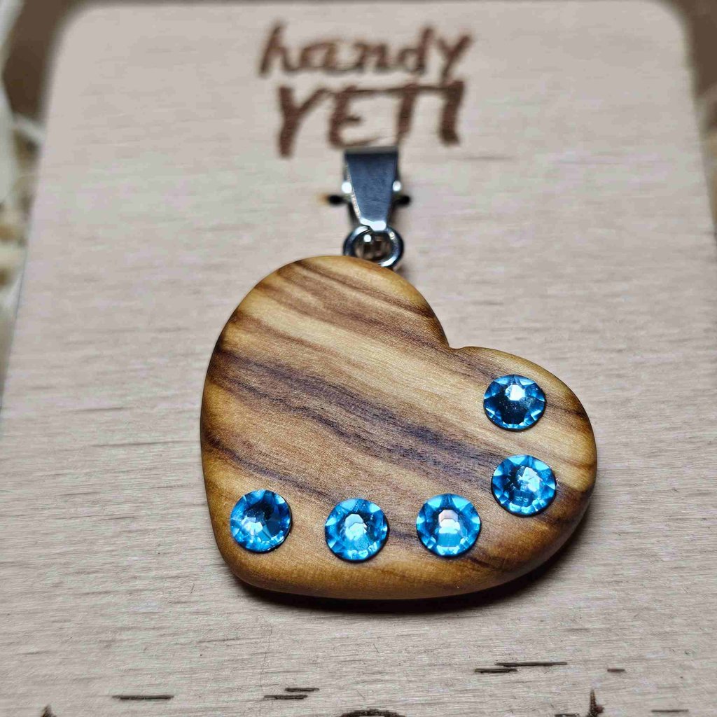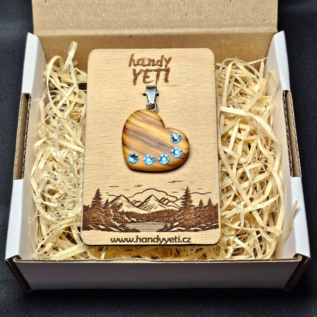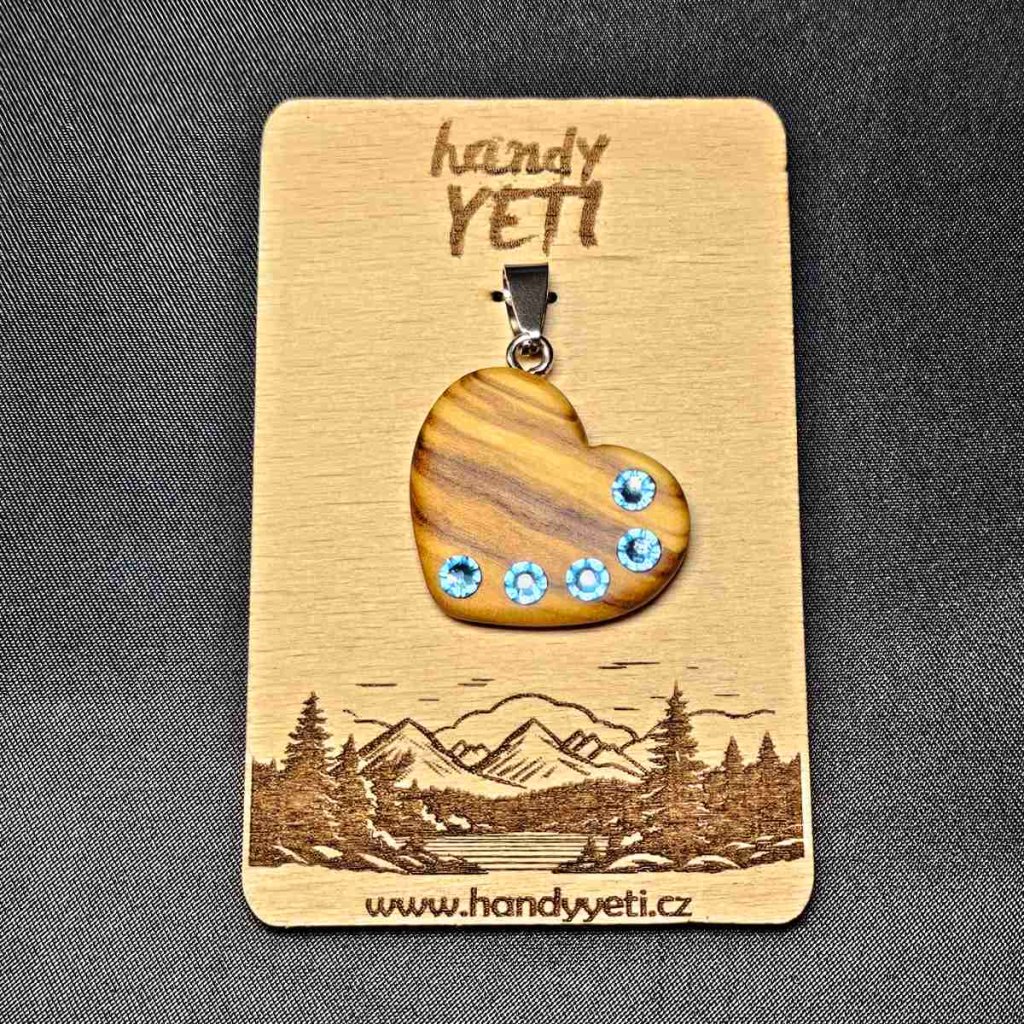 Přívěsek z olivového dřeva – srdce s modrými Swarovski krystaly Aquamarine