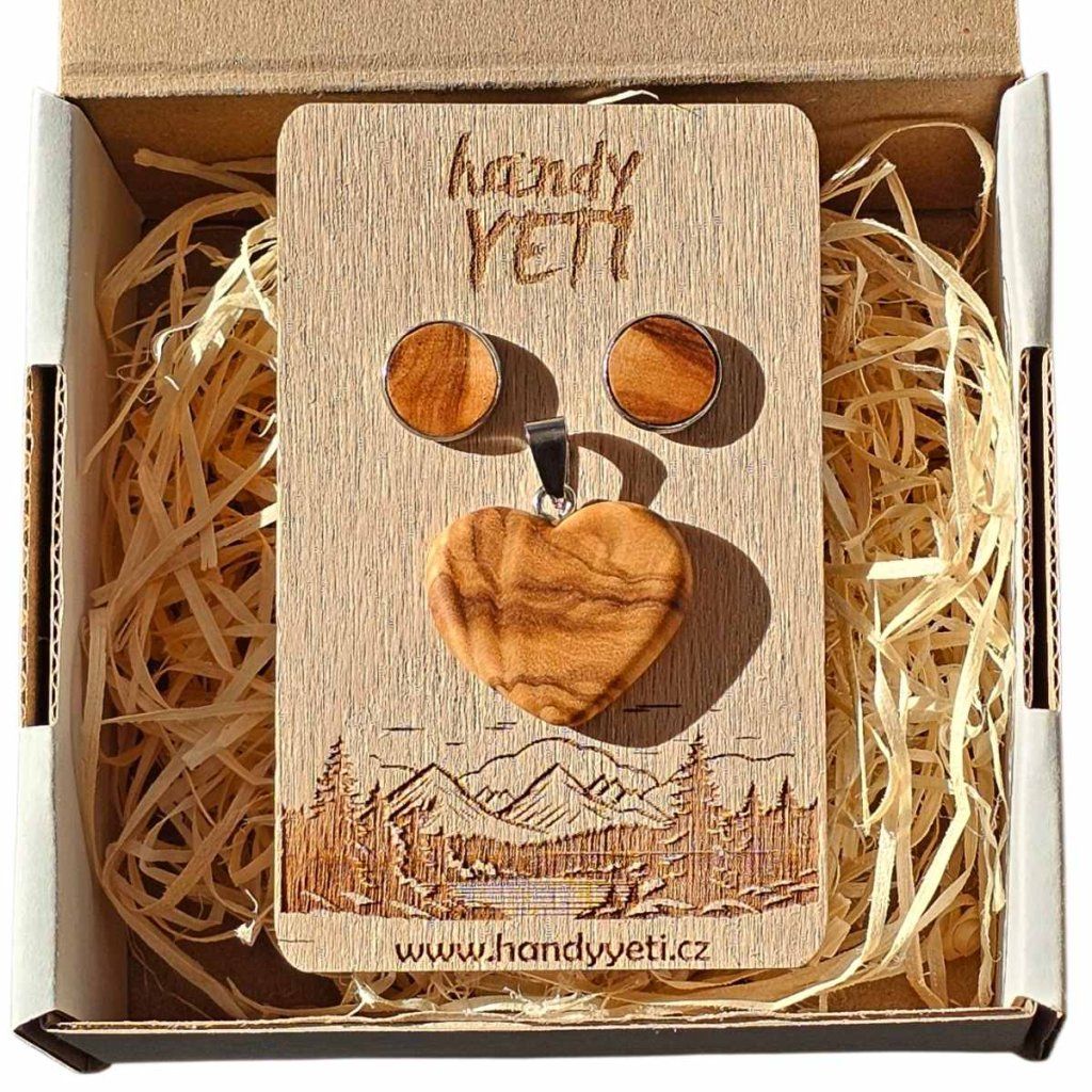 Ručně vyráběný set z olivového dřeva se srdcem a náušnicemi