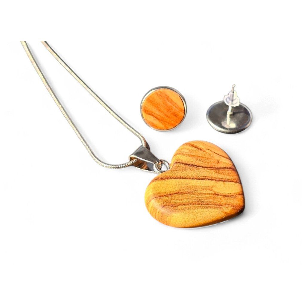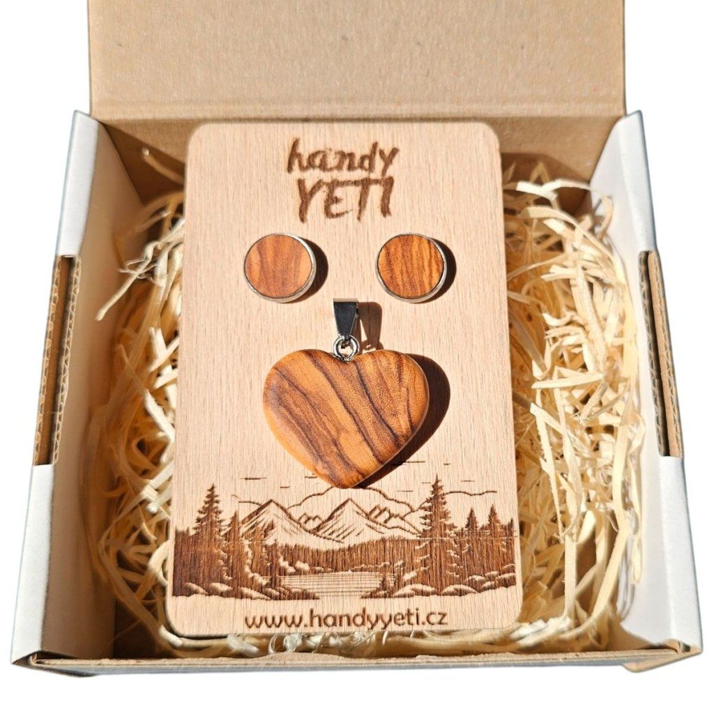 Tento set z olivového dřeva spojuje přirozenou krásu dřeva s jednoduchým, elegantním tvarem. Dominantou celé sady je přívěsek ve tvaru srdce, který je ručně vyřezávaný a pečlivě broušený tak, aby vynikla typická kresba olivového dřeva. Každý kus je díky tomu originál a může se lehce lišit odstínem i strukturou.