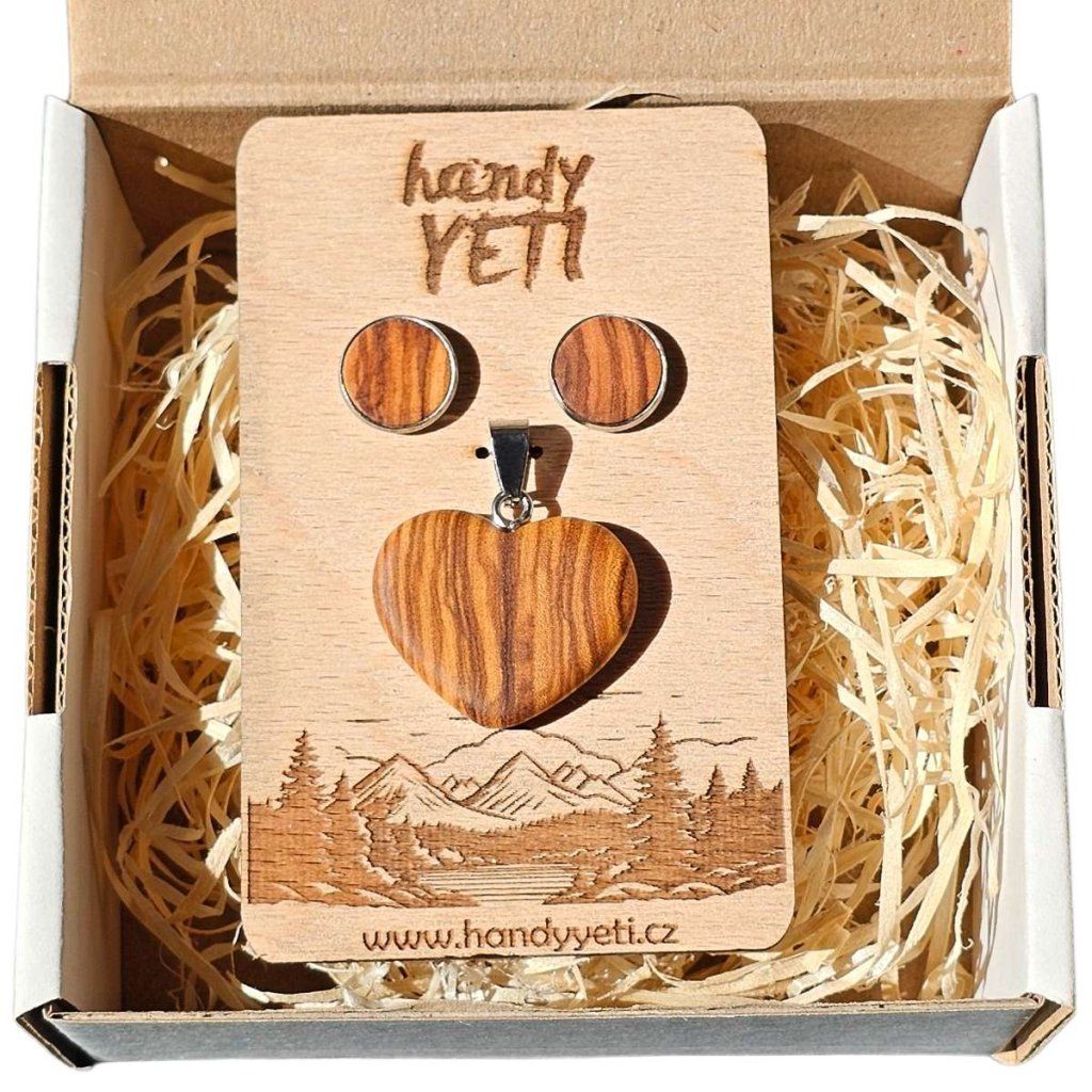U olivového dřeva nikdy nevzniknou dva stejné kusy. Právě to dělá z tohoto setu něco osobního – kresba na každém přívěsku i náušnicích je jiná, nepravidelná a přirozeně výrazná.